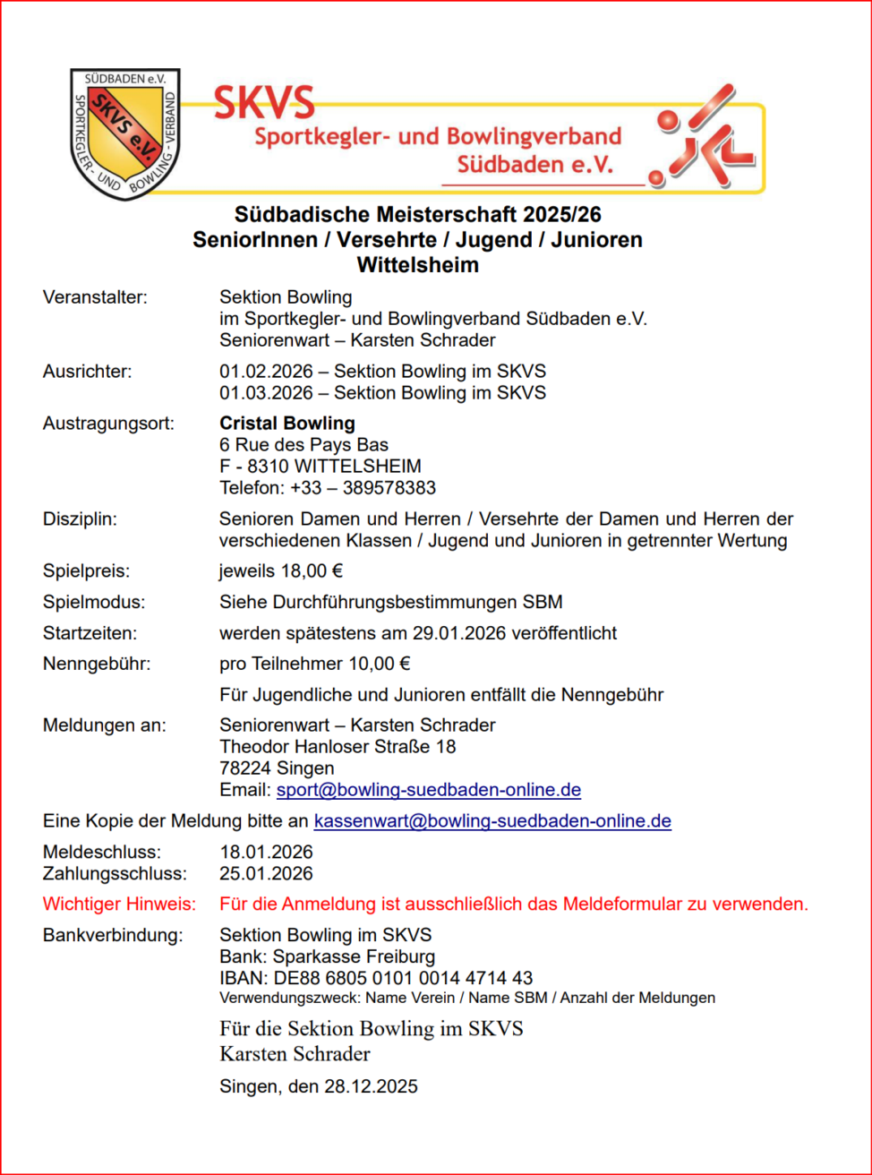 *** René Anlauf 300 am 1.7.2026 Bravo! *** Unsere Vereinsmeister 2025 sind Angela und Mas *** Unser Challenge Champion 2024/25 ist Sascha G. *** Trio Senioren A 1. Rang Sascha, Willy,Carlo *** SBM 2025 Doppel aktiv Angela & Anita 1.Rang Sascha G. & Dani 2.Rang